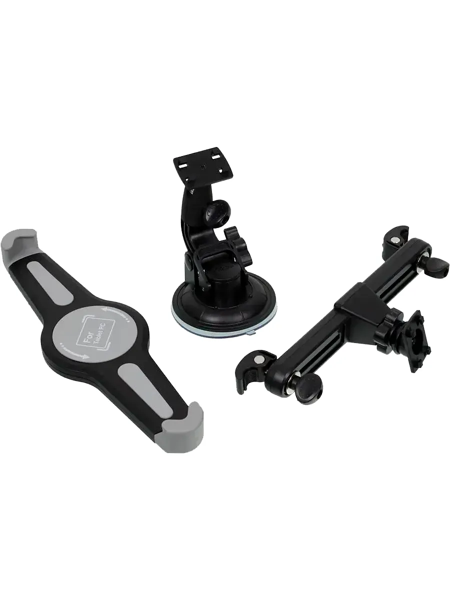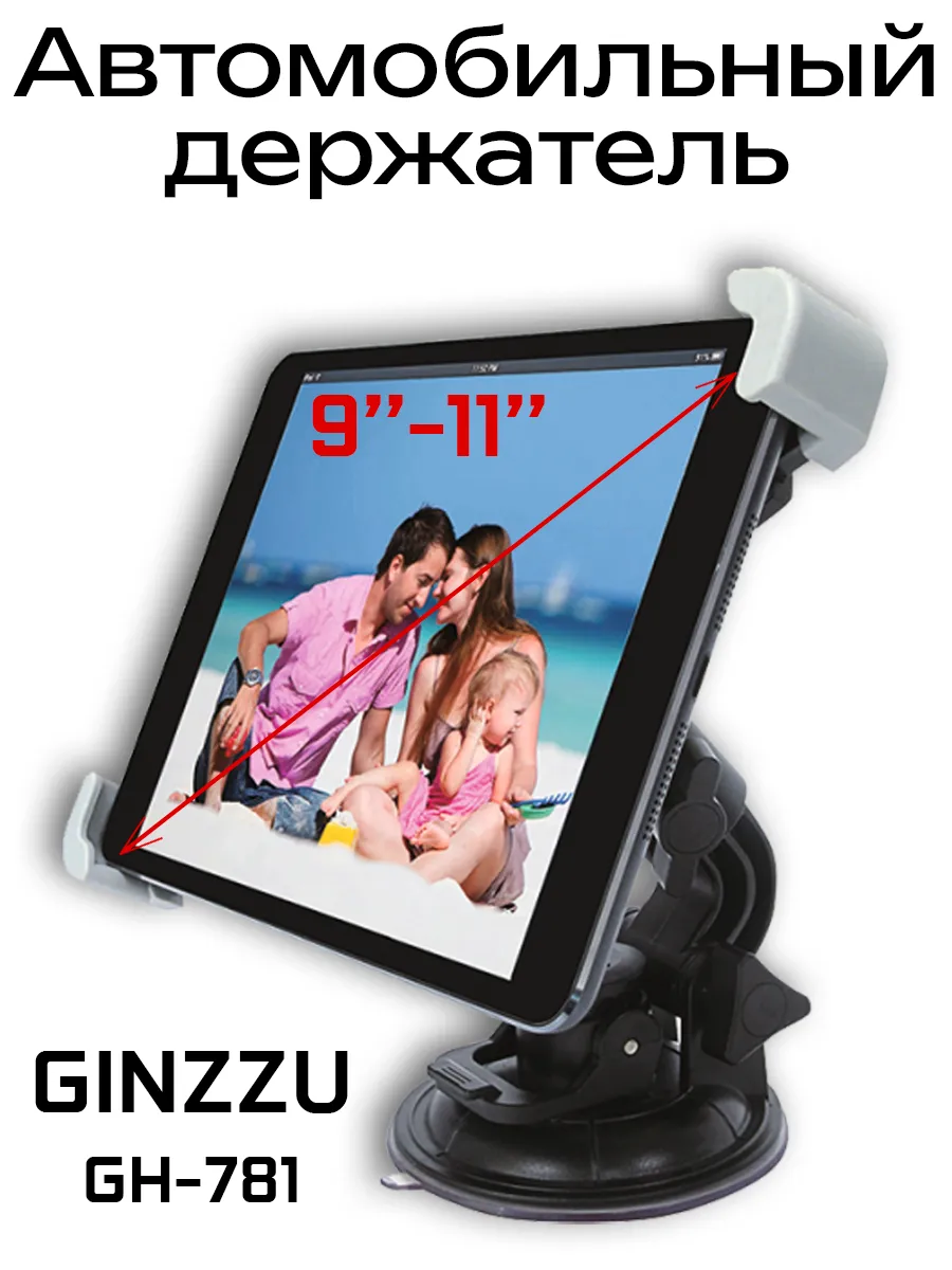 Ginzzu GH-781 — универсальный автомобильный держатель для планшетов с диагональю экрана от 9 до 11 дюймов. Позволяет разместить устройство на лобовом стекле автомобиля или на спинке переднего сидения.