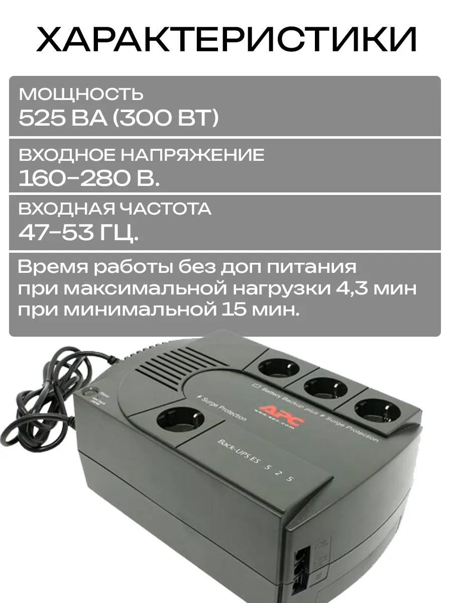 ИБП APC Back-UPS ES 525 — надежный защитник вашего оборудования от внезапных отключений электроэнергии и скачков напряжения. Модель обеспечивает резервное питание для подключенных устройств, давая вам время сохранить данные и корректно завершить работу. APC Back-UPS ES 525 оснащен защитой от перегрузок, короткого замыкания и импульсных помех, гарантируя безопасность вашего оборудования. Сменная батарея позволяет продлить срок службы ИБП, а время переключения на батарею всего 5 мс минимизирует риск потери данных. Четыре выходных разъема IEC-320 C13 обеспечивают подключение нескольких устройств, а RJ-45 порт защищает ваше интернет-соединение.