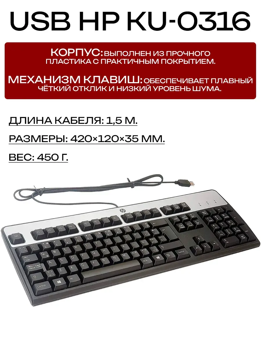 Клавиатура USB HP KU-0316 — проводная мембранная клавиатура с 104 клавишами.