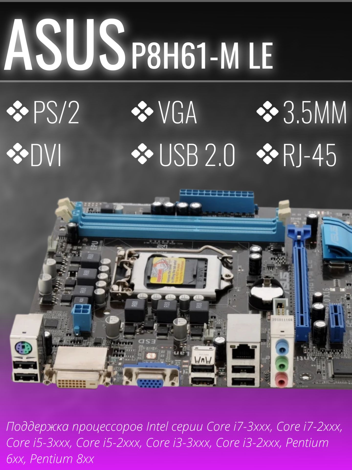 Материнская плата ASUS P8H61-M LE поддерживает процессоры Intel на сокете LGA1155, что делает её отличным выбором для сборок на основе мощных процессоров Intel Core i3, i5 и i7 второго и третьего поколений. Эта материнская плата форм-фактора mATX (Micro ATX) компенсирует свои компактные размеры возможностью установить до 16 ГБ оперативной памяти DDR3, позволив вам комфортно работать с высокопроизводительными приложениями и играми.