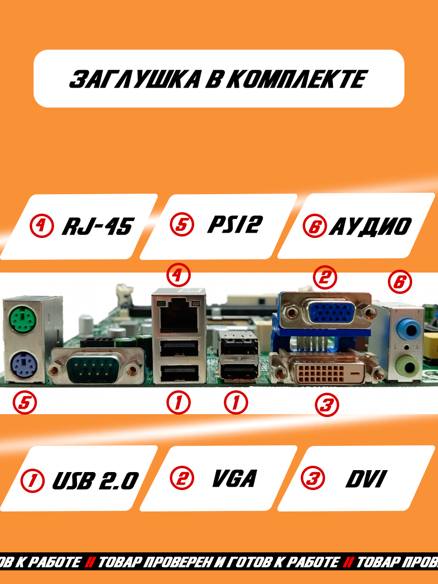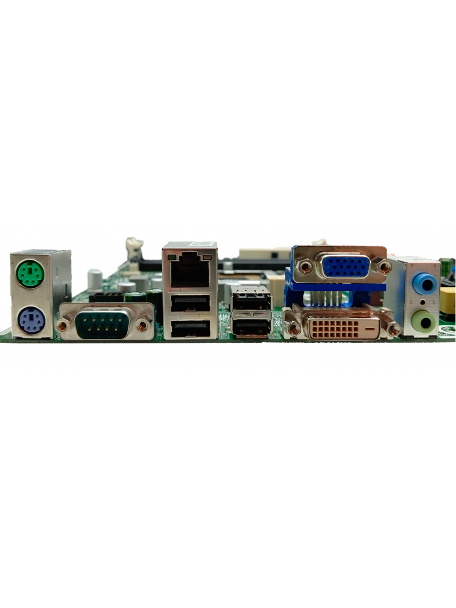 На задней панели материнской платы расположены разъемы DVI, VGA, 4 x USB 2.0 Type-A, LAN RJ-45, PS/2 (клавиатура/мышь), что обеспечивает широкие возможности подключения различных периферийных устройств.