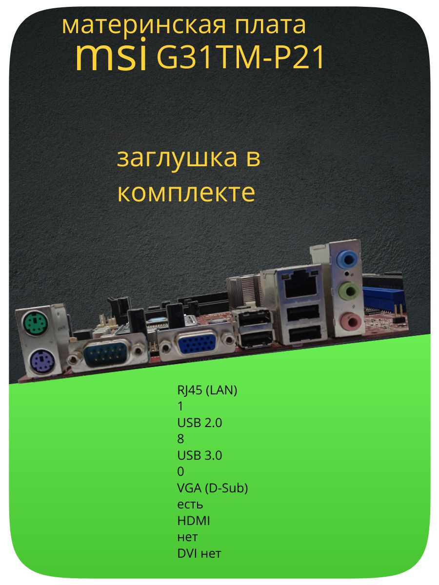 Материнская плата MSI G31TM-P21 обеспечивает стабильную работу компьютера благодаря продуманному дизайну и качественным компонентам. Подходит для системных блоков среднего класса, поддерживает современные процессоры Intel и оперативную память DDR2/DDR3.
