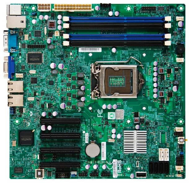 Socket LGA1155 Поддерживаемые процессоры Intel Core i3/Xeon E3-1200/Pentium/Celeron Поддержка многоядерных процессоров есть Чипсет Intel C204 BIOS AMI Поддержка SLI/CrossFire нет Память DDR3 DIMM, 800 - 1333 МГц Тип памяти только ECC Количество слотов памяти 4 Поддержка двухканального режима есть Максимальный объем памяти ECC 32 Гб IDE нет SATA количество разъемов SATA 3Gb/s: 4, количество разъемов SATA 6Gb/s: 2, RAID: 0, 1, 5, 10 Слоты расширения 4xPCI-E x8 Поддержка PCI Express 2.0 есть Звук нет Встроенный видеоадаптер есть, на основе Matrox G200 Ethernet 2x1000 Мбит/с, на основе Intel 82579LM/82574L Наличие интерфейсов 9 USB, 2xCOM, D-Sub, 2xEthernet, PS/2 (клавиатура), PS/2 (мышь) Разъемы на задней панели 2 USB, 1xCOM, D-Sub, 2xEthernet, PS/2 (клавиатура), PS/2 (мышь) Основной разъем питания 24-pin Разъем питания процессора 8-pin Тип системы охлаждения пассивное Форм-фактор microATX Дополнительная информация 2 слота PCI-E 8x работают в режиме 4x; 1 IPMI Lan порт (Realtek RTL8201N