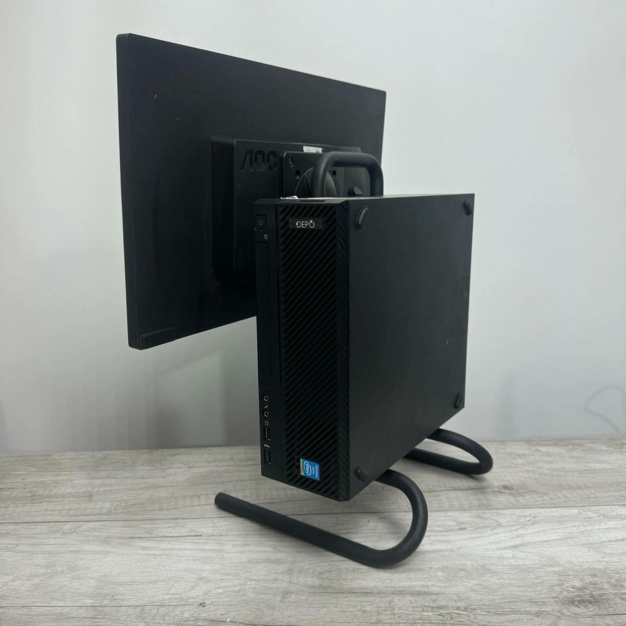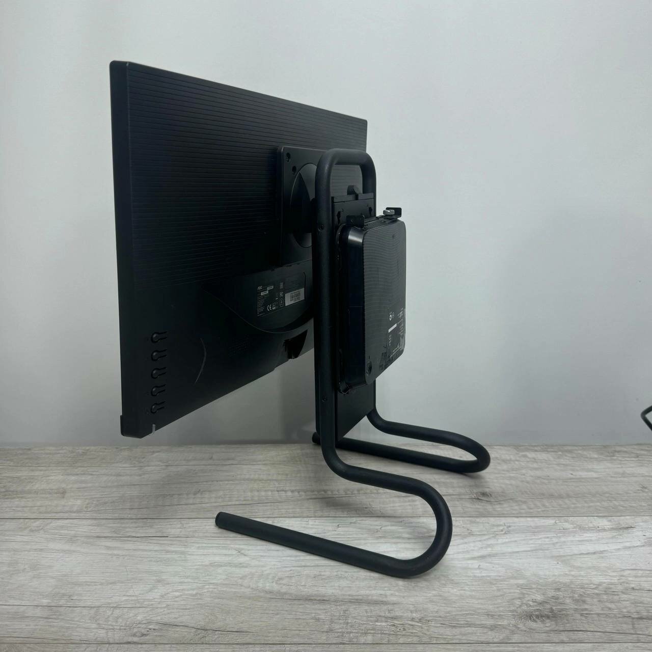 Подставка оснащена наклонным типом крепления, что позволяет регулировать угол наклона монитора или мини-ПК для оптимального обзора и комфорта. Установка на стол занимает минимум времени и не требует специальных инструментов.