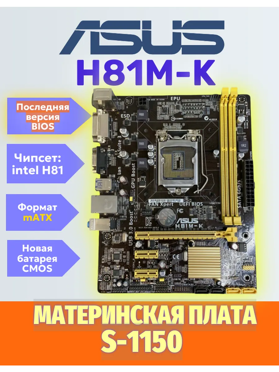 Материнская плата Asus H81M-K — надежная основа для сборки вашего персонального компьютера. Эта модель в форм-факторе Micro-ATX поддерживает процессоры с сокетом 1150 и до 16 ГБ DDR3 памяти, что обеспечит плавную работу как в повседневных задачах, так и в играх. На плате расположены 4 порта SATA для подключения накопителей, 2 порта PS/2 для подключения клавиатуры и мыши, а также 3 аналоговых аудиоразъема для подключения акустики. Asus H81M-K — отличный выбор для тех, кто ищет надежную и функциональную основу для своего ПК.