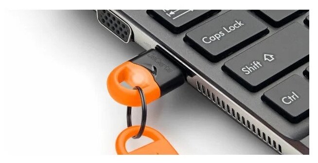 Плотно фиксируется в USB-разъёме, оснащён удобной и яркой цветной дужкой.